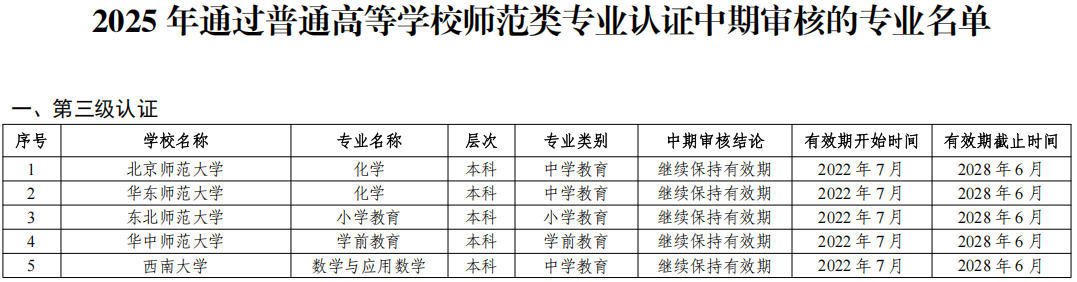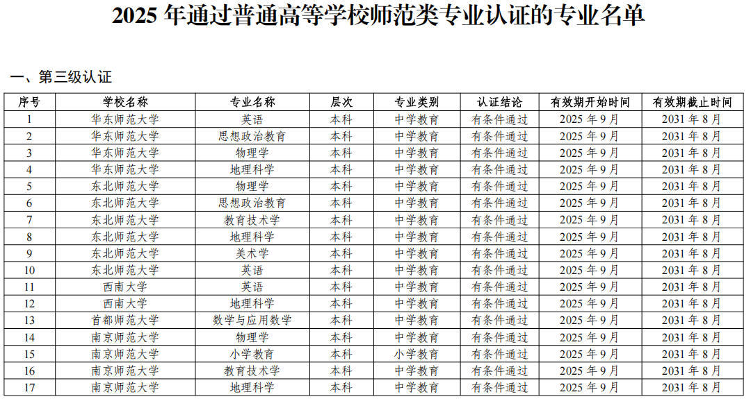 央广网北京10月21日消息(记者果君)教育部办公厅日前公布了2025年通过普通高等学校师范类专业认证专业名单及中期审核专业名单。经高校申请、教育评估机构组织专家考查、普通高等学校师范类专业认证专家委员会审定,华东师范大学英语专业等17个专业通过第三级专业认证,中华女子学院学前教育专业等576个专业通过第二级专业认证,认证结论有效期六年,自2025年9月起至2031年8月止。经高校提交整改材料、专家审查、普通高等学校师范类专业认证专家委员会审定,北京师范大学化学专业等386个专业通过了师范类专业认证中期审核,继续保持原认证有效期。